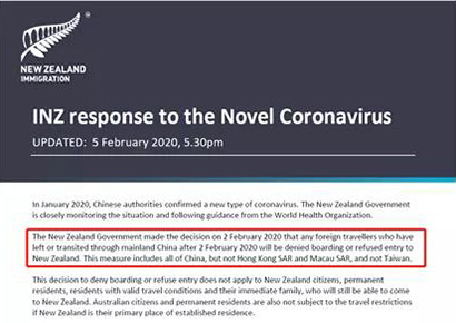 2月2日,新西兰政府宣布,为应对新型冠状病毒感染肺炎疫情传播带来的风险,将采取临时入境限制措施。从2月3日起,所有外国公民在自中国大陆离境或中转后14天内不能入境新西兰;新公民和永久居民及其直系亲属仍可进入新西兰。