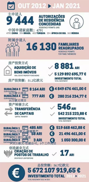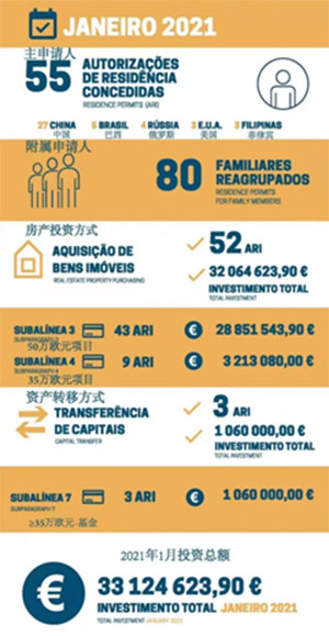 2021年1月,共计55位主申请人和80位附属申请人获批葡萄牙黄金签证,总投资额达3312万欧元。有52位客户是通过购房移民的方式获得的,投资额为3206万欧元。从主申请人的国籍来看,来自中国的投资者为27位,保持榜首地位。