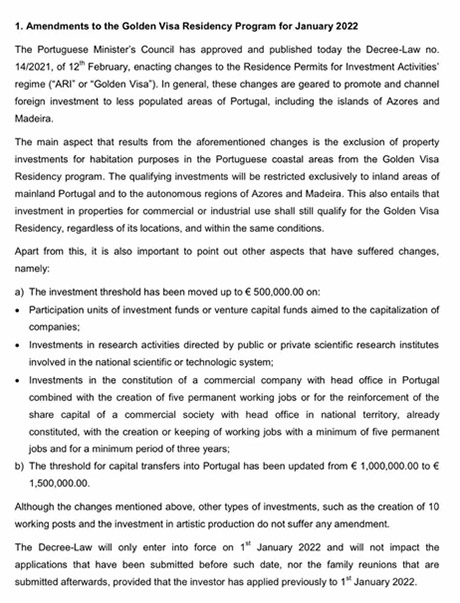 近日,葡萄牙政府批准并发布了2月12日的14/2021法令,对投资居留许可政策进行了修订。以促进外国投资并将其引导到人口稀少的葡萄牙内陆地区,及亚速尔群岛和马德拉群岛。