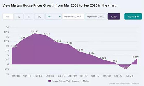 CEIC数据显示马耳他房价仅在疫情期间下降2.6%,严重期过去后,2020年第二季度房价恢复,并上涨3.3%,所以即使遇到了疫情,马耳他的房产市场趋于平稳,未受到太大的影响。